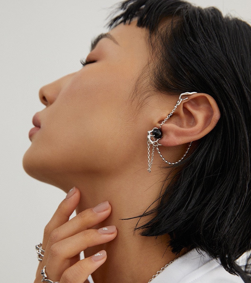 Designed with natural fluid elements, the irregular surface has a fluid undulating feel with chain accents for a great design, and the black agate inlay embellishes the earlobes adding a high-end jewellery touch.