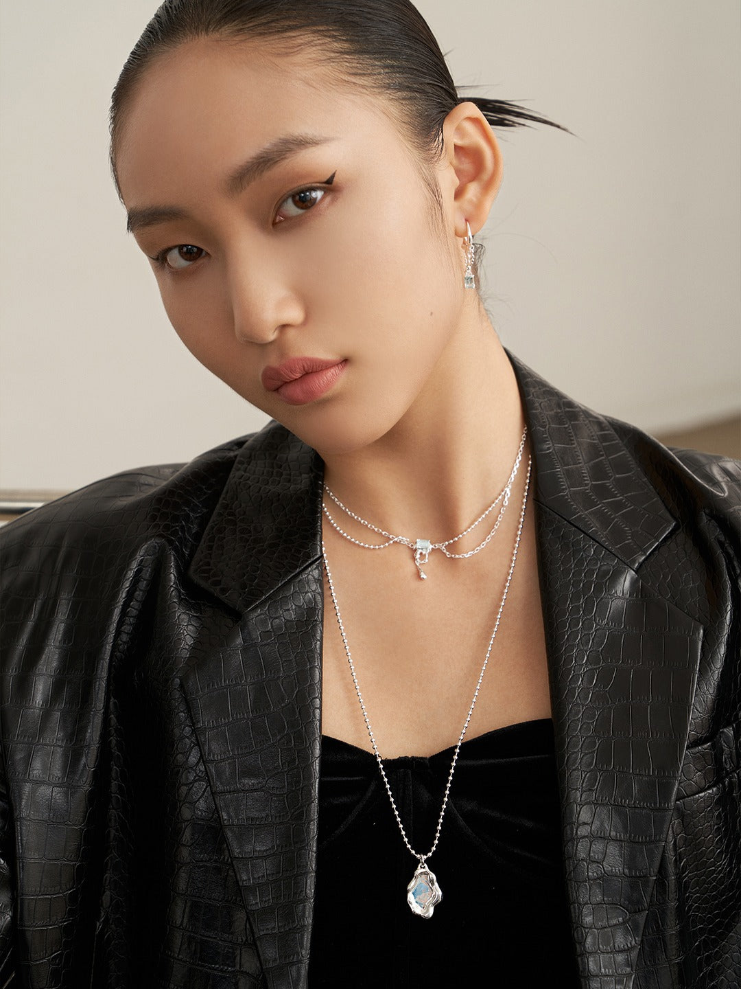 The design uses the undulating structure of flowing water to design the body of the ear hooks, and is complemented by two different types of silver chains to combine the main earrings for a more visually appealing and impactful look. The drop of aquamarine topaz is like a dotted drop of water, glistening in the sunlight.